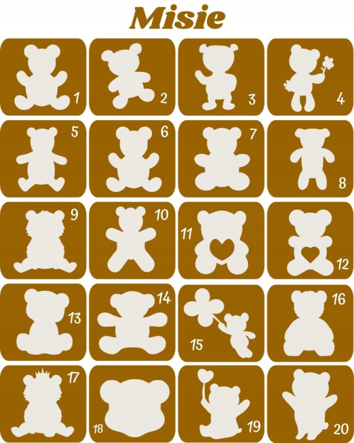 Zestaw składa się z 20 różnych szablonów do tatuaży brokatowych przedstawionych na powyższej grafice. Każdy szablon jest wycięty osobno.